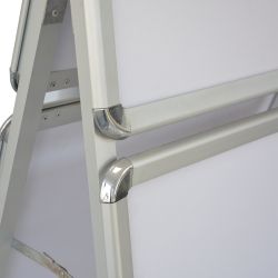 • Zusammenklappbare weisse Kunststoffstaffelei - mit Wasser beschwerbar • Auswechselbare starre Anzeige im Format A1 • Zwei kleine individuell gestaltbare Bereiche oberhalb der verzierbaren Fläche für Ihre Logos • Anwendung im Aussenbereich möglich