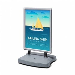 • Cadro'clap double-face profilé 32 mm monté sur ressorts • Pour affiches format A1 • Base plastique à lester • Déplacement aisé sur roulettes • Utilisation extérieure