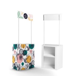 Comptoir en polypropylène entièrement décorable. Etagère de rangement incluse. Sac de transport souple. Médias recommandés pour le visuel : films adhésifs HIGH TACK