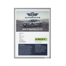 • Vitrine d’intérieur - épaisseur 20 mm - cadre en aluminium anodisé - vitrage plexiglas avec entourage aluminium à partir du format 6 feuilles A4 • Porte battante avec fermeture à clef • Fond tôlé blanc permettant l’affichage magnétique • Fixationmurale aux 4 coins de la tôle